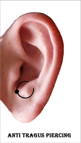 Anti Tragus Piercing: als Anti Tragus Piercing bezeichnet man den dem Tragus gegenüberliegenden Knorpelfortsatz. Das Anti Tragus Piercing ist sehr schmerzfrei und blutet kaum. Es kann sogar gedehnt werden. Als Piercingschmuck kommen Ball Closure Rings oder Labrets in Frage. Die Abheilungszeit ist sehr unterschiedlich und kann von 2 Monaten bis zu über einem Jahr andauern. Auf aggressive Desinfektionsmittel wie Alkohol ist zu verzichten. Desinfiziert wird am besten, wie bei allen Piercings, mit Lokalantibiotikum ( Tyrosur ).