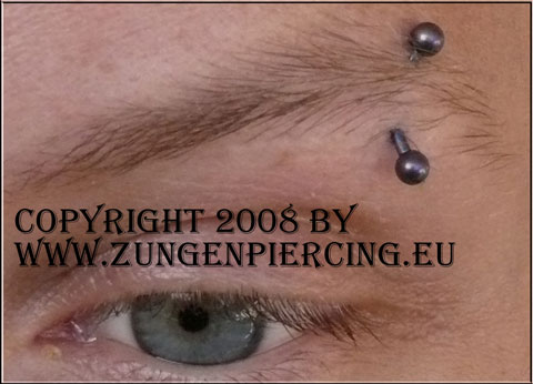 Augenbrauen Piercing: das Augenbrauenpiercing ist ein sogenanntes Oberflächenpiercing, das unter der Haut auf einer Stichkanaleingang und Stichkanalausgang gleichen Ebene liegt.Es kann über die ganze Augenbrauenlinie gepierct werden, wird aber bevorzugt im äusseren Drittel der Augenbrauen gestochen. Weil das Augenbrauenpiercing nur unter der Haut liegt ist Vorsicht im Umgang geboten, da das Piercing bei Entzündungen herauswachsen kann und Narben hinterlässt. Die Verletzung der Nerven ist eine weitere Problematik bei dieser Piercingart. Als Piercingschmuck kommen gebogene Barbells ( Curved Barbell ) oder Ball Closure Rings zum Einsatz. Piercingbananen haben wir bei diesem Piercing auch schon gesehen. Es kann horizontal oder vertikal gestochen werden.
