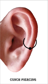 Conch Piercing: beim Conchpiercing kommt ein grösserer Ball Closure Ring zum Einsatz und wird wie beim Lobe durch die ganze Ohrmuschel getragen, jedoch auf mittlerer Höhe der Ohrmuschel. Da es sich hierbei um Knorpelgewebe handelt, wird das Loch meistens ausgestanzt ( gepuncht ) und nicht gestochen, da Knorpel nicht so gut , wenn überhaupt nicht, dehnbar ist. Insgesamt wird zwischen dem Inner Conch und dem Outer Conch unterschieden. In der Abheilungszeit bedarf es sehr korrekter Pflege und Vorsicht. Dann ist die Heilungszeit nicht sehr problematisch.